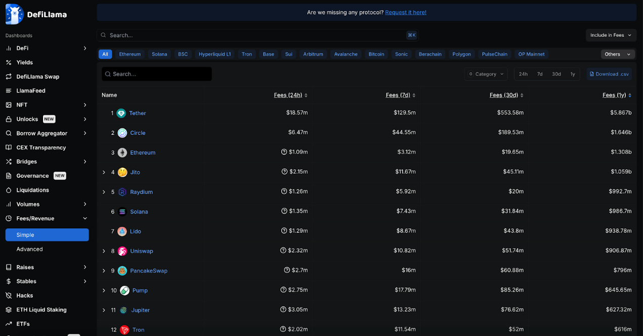Solana 的手续费生态在过去一年增长最快,Jito、Raydium 和 Pump.fun 都赚取了巨额手续费。这很可能主要得益于 Solana 上 memecoin 的大幅增长。