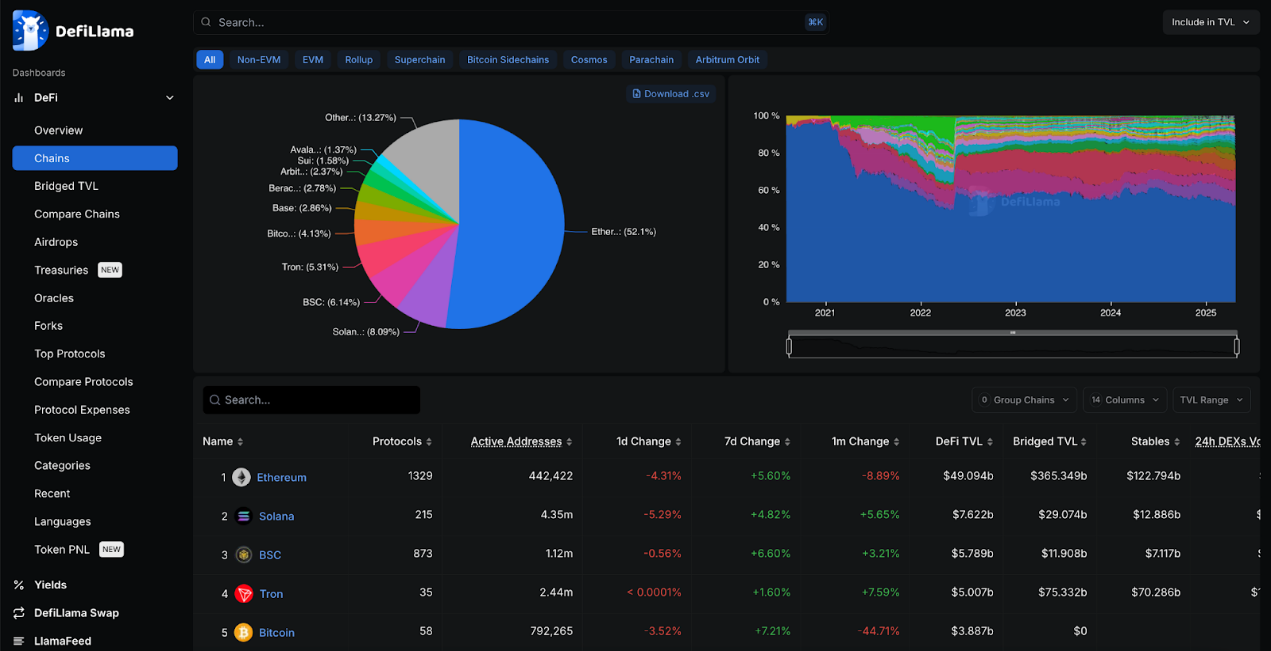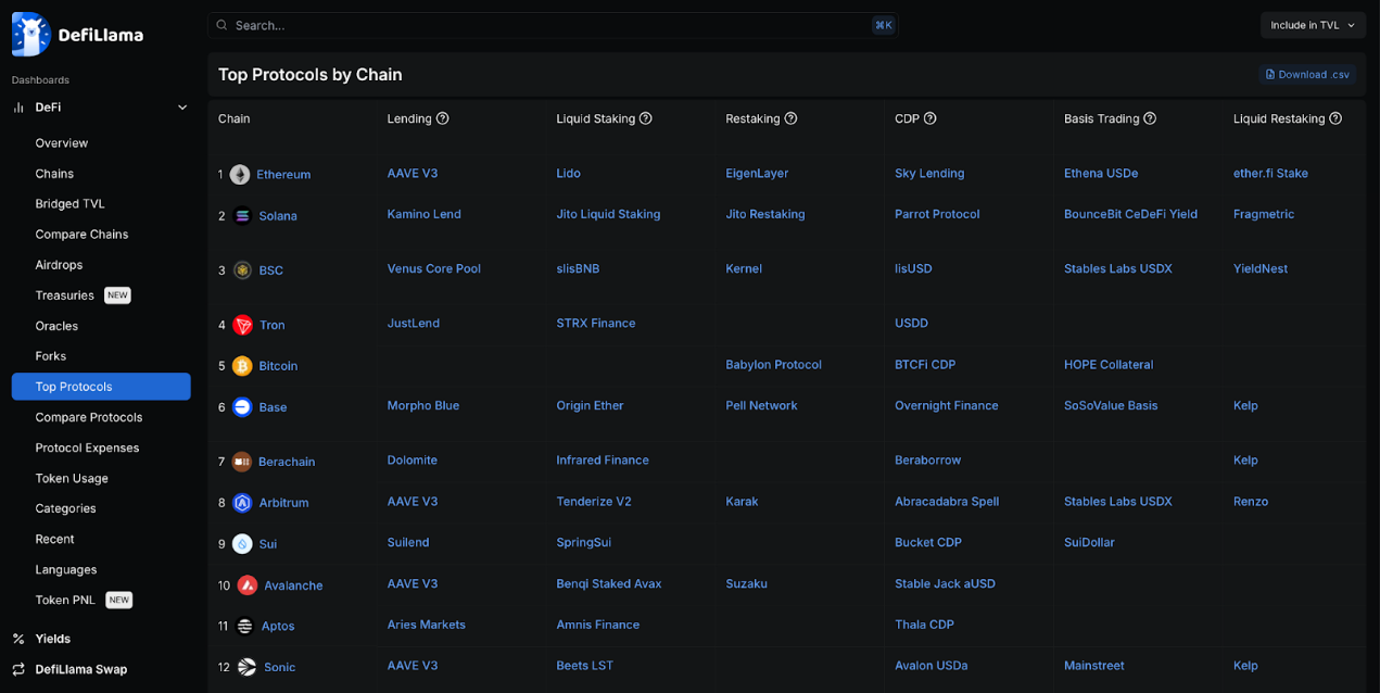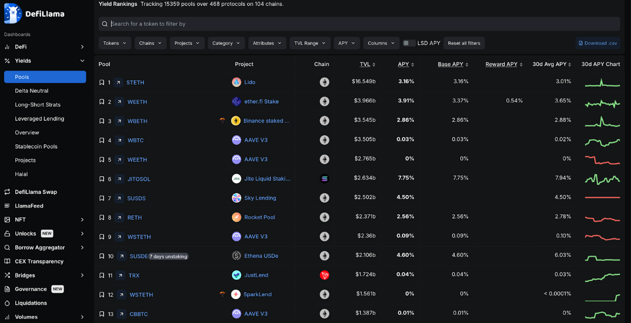 DeFiLlama 追踪了 104 条区块链上 468 个协议中超过 1.5 万个流动性池。