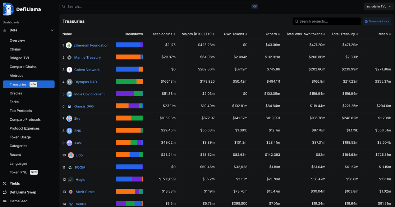 一些以太坊相关项目也以金库总额占据主导地位,例如 Aave、ENS、Lido 和 Sky。然而他们也大多持有自己的代币。