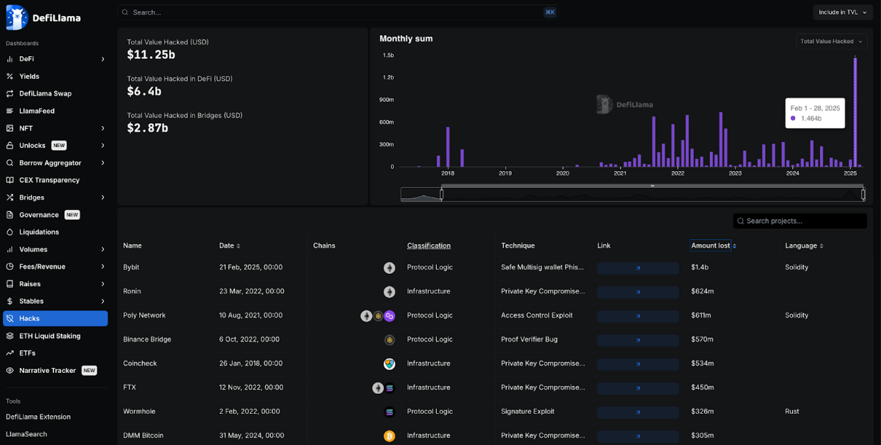 今年 2 月 ByBit 遭受黑客攻击,是加密历史上最大的单次黑客攻击,损失超 14 亿美元。而第二大黑客攻击发生在 2022 年,针对 Ronin 网络的攻击导致 6.24 亿美元损失。