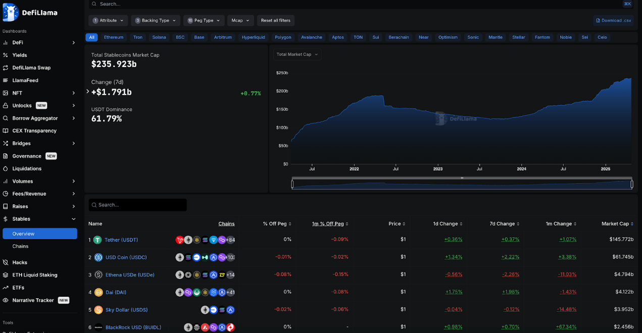 USDT、USDC、DAI/USDS 和 USDe 合计占稳定币市场约 93%,市值超过 2200 亿美元。