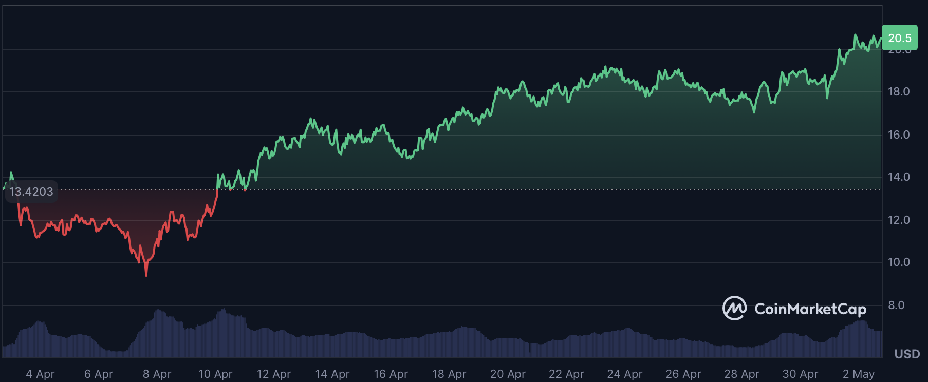 恰巧在 Arthur Hayes 发文前后,Hyperliquid 从数据面来看,自 4月7日的低点以来,HYPE 已累计飙升超过 115%,展现出强劲的短期上升趋势。近一个月来,其月度涨幅也高达 55%。