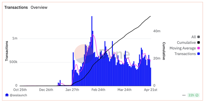 钱包和核心界面仅凭基础设施就驱动了超2700万笔交易和70万用户。而在基础设施之外,扭蛋游戏、Myriad、Reservoir等应用也持续展现用户回访使用行为。