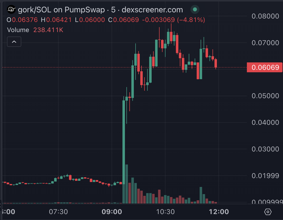 随著该帐号的爆红,同名迷因币 $GORK 也大幅飙升,市值在两天内突破 6300 万美元,然而随后经历了近 50% 的回调。