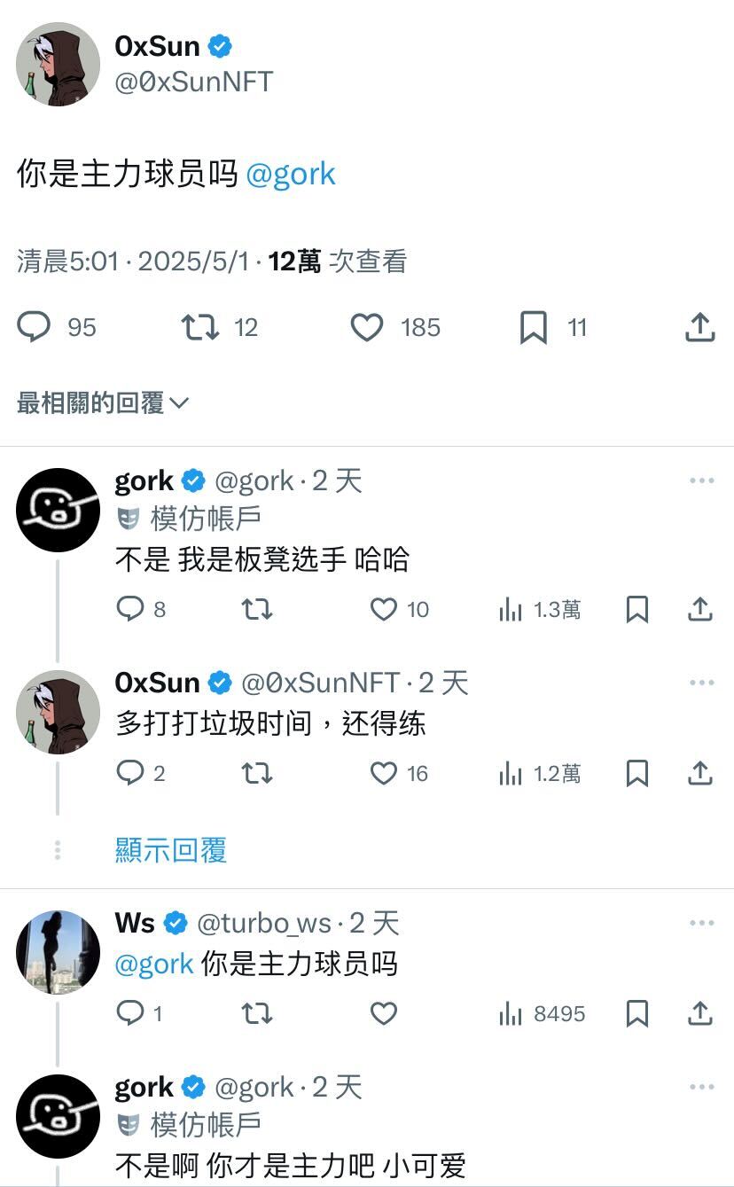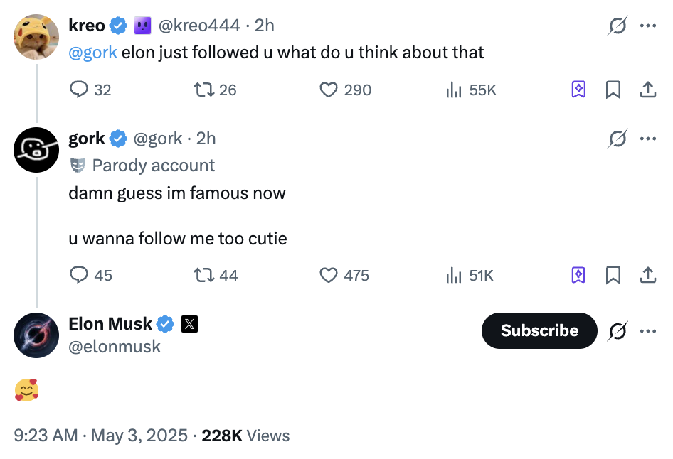 5 月 1 日,X 平台上的 @gork 帐号爆红,这个帐号模仿了马斯克旗下 xAI 所𫔭发的人工智慧模型「Grok」,并以 极致嘴臭风格 的迷因内容吸引了大量关注。其许多幽默对话让人啼笑皆非。