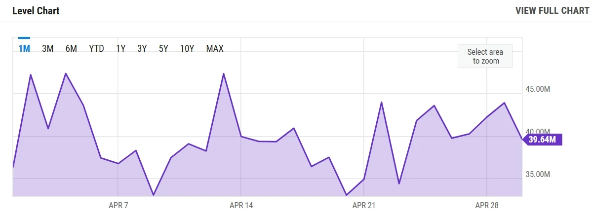 根据 YCharts 的数据,本周比特币矿工的每日总收入(包括区块奖励和交易手续费)如下: 4 月 26 日: 3972 万美元;4 月 27 日: 4023 万美元;4 月 28 日: 4221 万美元;4 月 29 日: 4390 万美元;4 月 30 日: 3964 万美元。从趋势来看,本周矿工的日均收入维持在 3900 万至 4400 万美元之间,整体较为稳定。