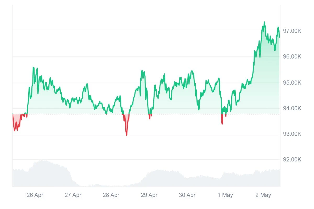 周内最低回调至 92, 933 美元,测试下方支撑区间的有效性。随后价格迅速反弹,确认 93, 500 美元与 94, 000 美元构成短期稳固支撑带,成为多头防御的核心区域。5 月 1 日,比特币突破 97, 000 美元关口,触达本轮反弹高点,但 97, 500 美元上方仍存较强压制,短期内构成主要阻力位。