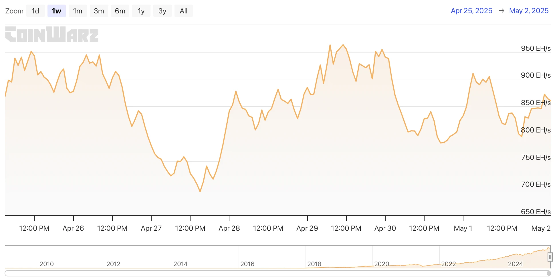 在 2025 年 4 月 26 日至 5 月 2 日期间,比特币网络哈希率呈现波动,具体情况如下:
