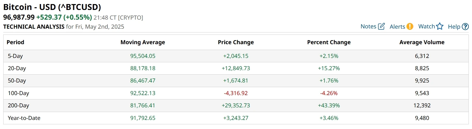 当前价格(市场价): 约 96, 800 美元(位于两条均线上方)