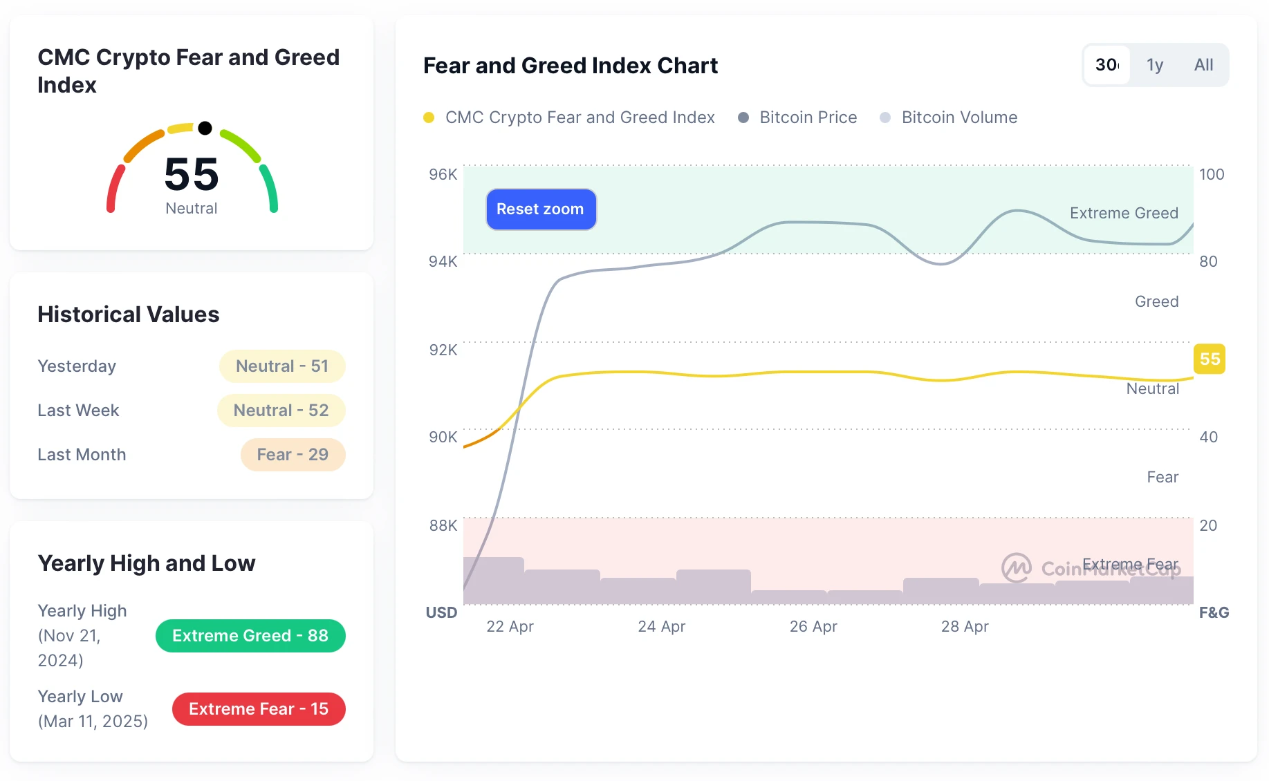 根据 CoinMarketCap 数据,截至 5 月 2 日,恐惧与贪婪指数(Fear & Greed Index)为 55 ,处于“中性”区域。本周指数呈现平缓趋势: 4 月 26 日: 53 (中性);4 月 27 日: 53 (中性);4 月 28 日: 51 (中性);4 月 29 日: 53 (中性);4 月 30 日: 52 (中性);5 月 1 日: 51 (中性)。