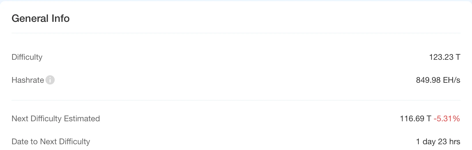 根据 CloverPool 数据显示,截至 2025 年 5 月 2 日,比特币全网算力为 849.98 EH/s,当前全网挖矿难度为 123.23 T,预计下一轮难度调整将在 5 月 4 日进行,预计下降幅度为 5.31% ,难度将下降至 116.69 T。这一趋势显示出,在比特币价格短期企稳的背景下,部分能效较差、运行成本较高的矿机逐步退出市场,导致全网算力增长放缓甚至小幅回撤。难度的下调将在一定程度上减轻剩余矿工的挖矿压力,从而短期内改善矿工的盈利能力。