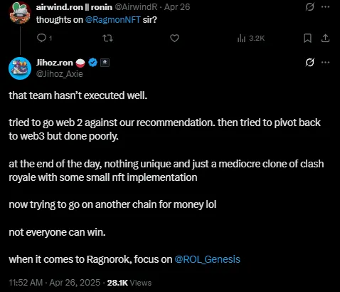 实际上,在Aleksander Larsen正式发文宣布与ROMW 决裂 的前一天,部分社区玩家已经发现双方明显存在嫌隙。在一篇Ronin生态近期大肆宣传的钓鱼游戏《Fishing Frenzy》 的帖子中,Ronin 联合创始人 Jihoz毫不掩饰地对ROMW进行批评,直言该游戏只不过是“拙劣的山寨版《皇室战争》”。 Jihoz称ROMW要去其他平台赚钱,并直接拉踩,表示现在只专注于《Ragnarok Landverse: Genesis》。