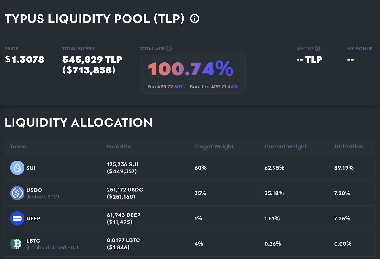 TLP 池中的资产包括 $SUI、$USDC、$DEEP 和 $LBTC,而 APR 目前超过 100%。