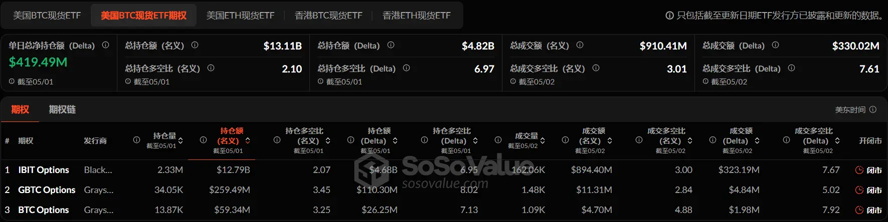 截至 5 月 2 日,美国比特币现货 ETF 期权名义总成交额为 9.10 亿美元,名义总成交多空比为 3.01。
