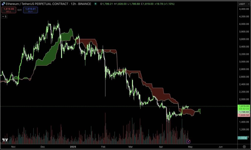 匿名加密交易员 CRG 指出 ,ETH 价格首次自 2024 年 12 月以来恢复到 12 小时 Ichimoku 云指标之上。Ichimoku 云表明,当价格高于云且云变绿时,显示出上升趋势,表明看涨情绪。