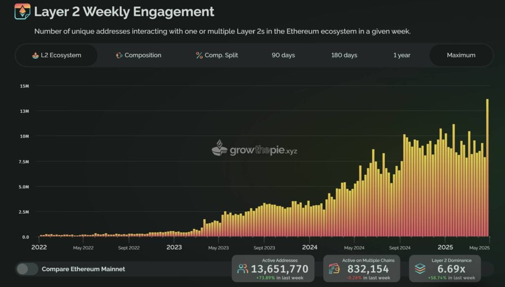 来自 growthepie.xyz 的资料 表明,与以太坊生态系统中的一层或二层网路互动的独特地址数量达到 1360 万的历史新高。活跃地址的比例在过去一周上涨了 74% ,这意味著网路的可扩展套件性和不断增长的采用。