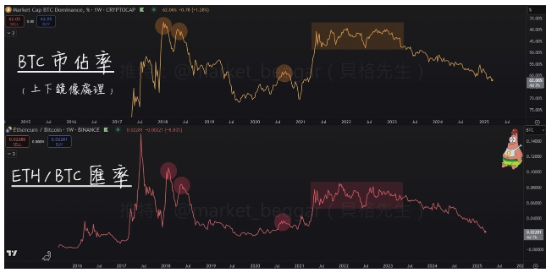 BTC.D 的走势,有很大一部分都是受到 ETH 的牵引。