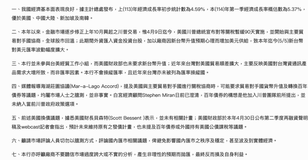汇率的部分,只是对应川普在4/2对等关税后的自然预期…我也要呼吁厂商不要因为不实的资讯而走向抛汇,不管怎样做出非理性的行为只会损失自己的利益,我们中央银行也会尽量让市场冷静下来。