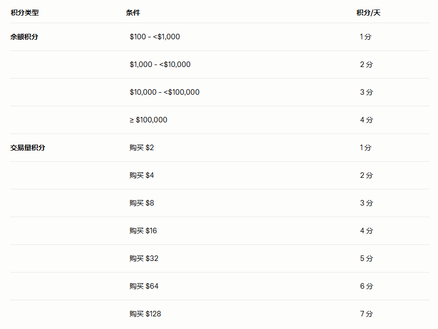 注:交易量积分每翻倍额外加1分,余额快照时区为UTC。