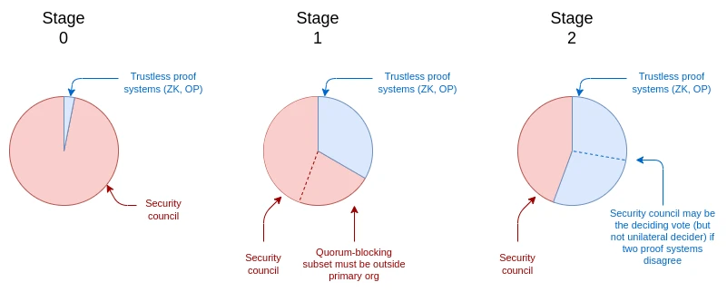 阶段 0 :安全委员会拥有完全控制权。可能有一个运行中的证明系统( Optimism 或 ZK 模式),但安全委员会可以通过简单的多数票机制推翻它。因此,证明系统仅为“咨询性质”。