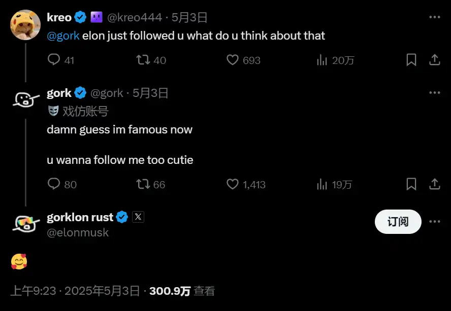 5 月 1 日,GORK 官推发布了一项回归公告,不久之后 Moonshot 上线 Solana 链上 Meme 币 GORK, 5 小时市值突破 5000 万美元。5 月 3 日,马斯克在 X 平台关注 @gork 账号,并在相关推文下回复笑脸表情,名人效应引发了社区对 gork 项目的关注。