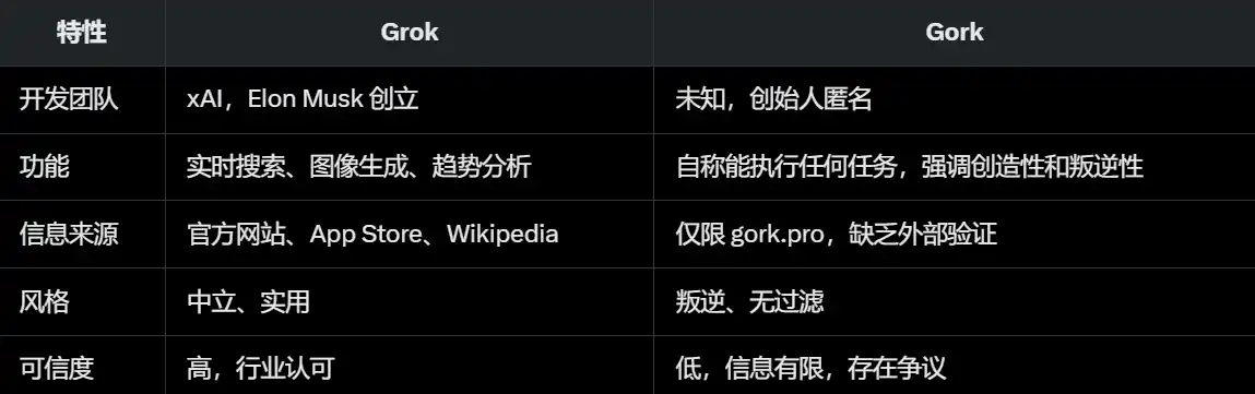 为了进一步确认,小编询问了 Grok「Gork 和 Grok 之间有什么联系」,Grok 给出的回答是「Gork 和 Grok 是独立的实体,没有官方联系。Grok 是 xAI 的正式产品,有明确的行业支持,而 Gork 似乎是一个独立项目,可能是一个模仿账号或概念性实体,其真实性和可信度较低,未与 xAI 或 Elon Musk 建立明确联系。」并且给出了二者特性对比,图表如下: