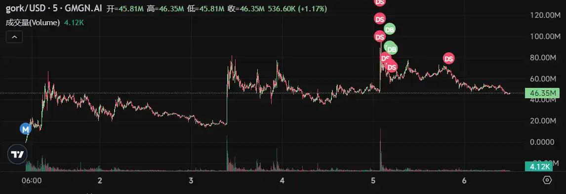 5 月 5 日,马斯克将 X 头像更换为「gork」主题 Meme 图(如下左图),并将 X 昵称从「Elon Musk」更改为「gorklon rust」;半小时后,马斯克再次更换 X 头像为另一张 gork 主题图(如下右图)。这一对 GORK 的戏谑致敬,激起了市场对该 meme 币的狂热,持续引发市场波动。gork 代币短时暴涨 107%,市值冲高至 1 亿美元后回落至 7540 万美元。