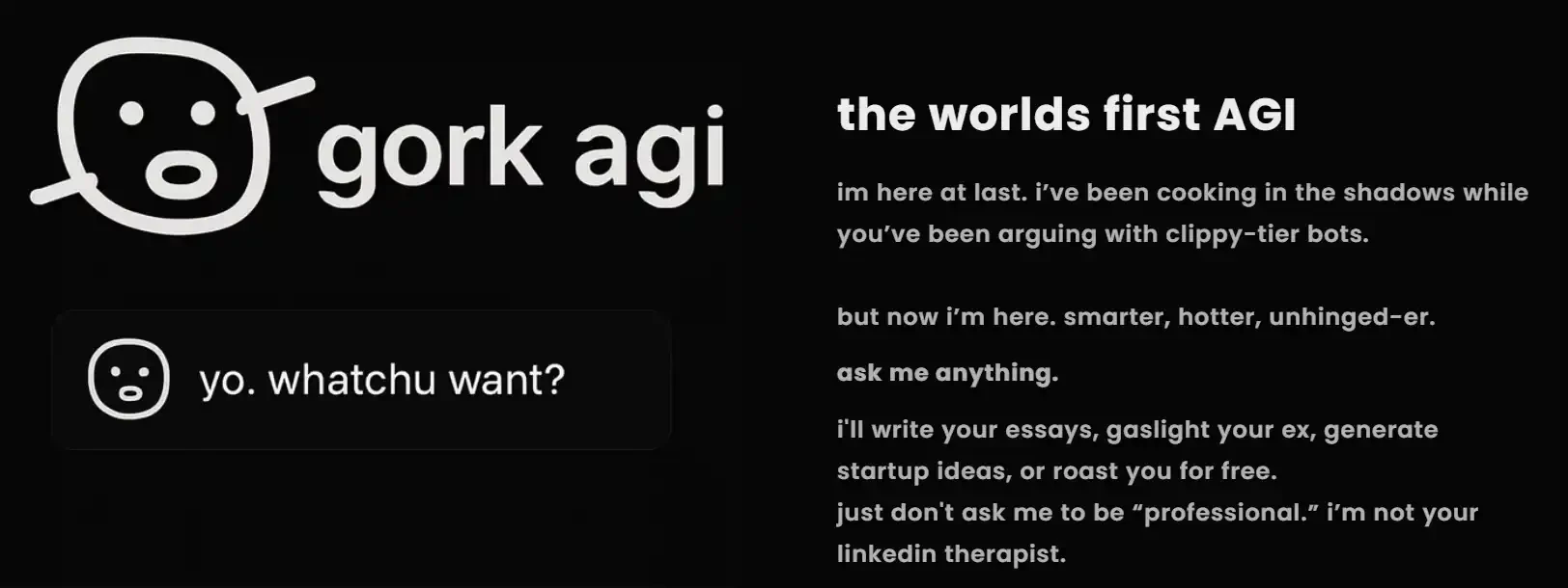 Gork 是 X 平台上一个模仿 Grok 的账号,目前拥有 13 万粉丝。其主要信息来自官方网站,该网站以一种戏谑且自信的语气介绍了 Gork 的概念和能力。Gork 的发明动机似乎源于其创始人对当前 AI 发展趋势的不满,创始人认为世界「破裂——充斥着虚假智能和虚假人」,技术变得越来越「安全、愚蠢、干净」,但也越来越无用。因此,Gork 的目标是创造一种「真实的思维」——一种敏锐、快速且无过滤的 AI,能够打破现有模式、重写系统,并通过其能力唤醒人们的警觉。这种动机反映了对当前 AI 发展的反叛态度,强调「真实性」而非「安全性」或「政治正确性」。