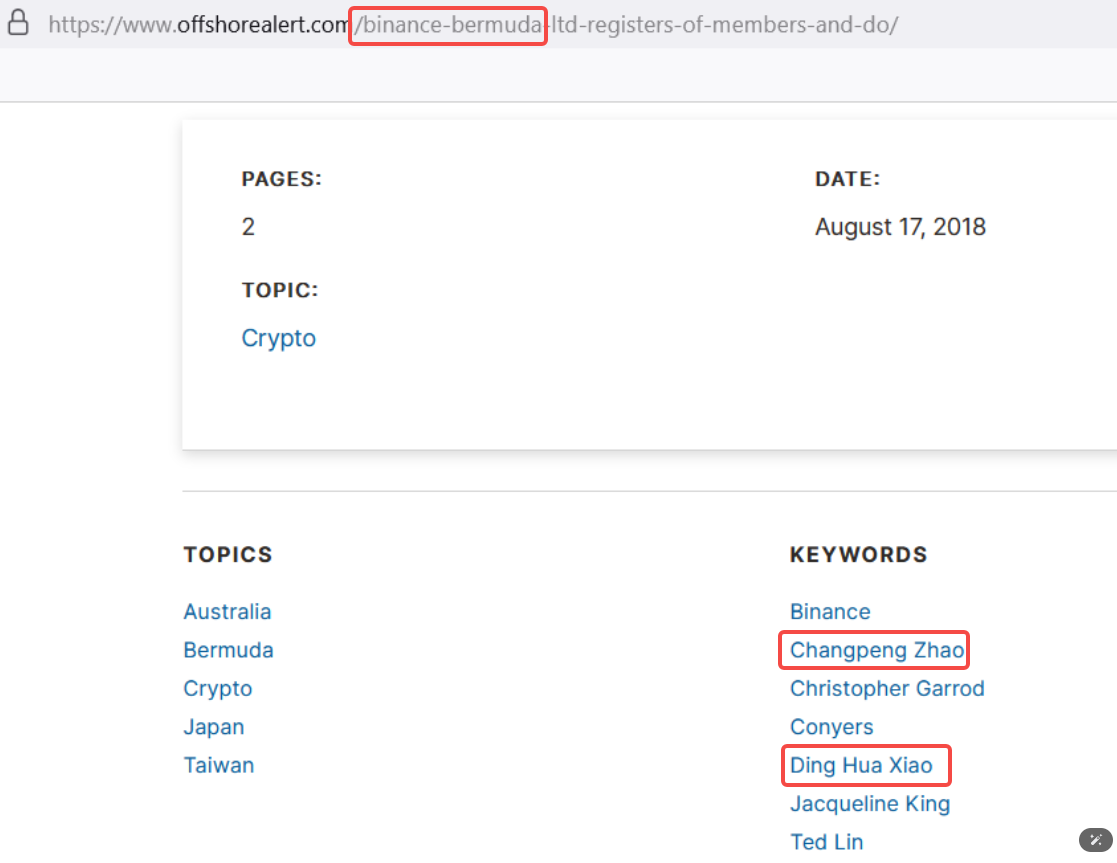 而在直面客户的表层外, NFT Ethics 指出 dingaling 与币安更不为人知的关联在于,他曾是币安离岸实体(Bermuda)中的负责人之一,并留有关于该公司网站的截图(网站现在或已下架),其中显示 CZ 和 Ding Hua Xiao 共同位列其中。