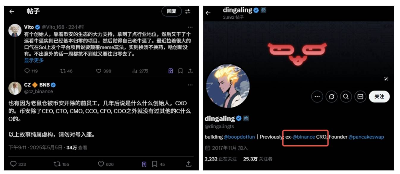 最有意思的地方在于,dingaling 的个人简介(25 万关注)上,除了标明自己是 Pancakeswap 的创始人外,确实有个前币安 "CRO"的头衔,再结合 CZ 说的币安从来没有某 CXO 的头衔,让暗指落到了实处。