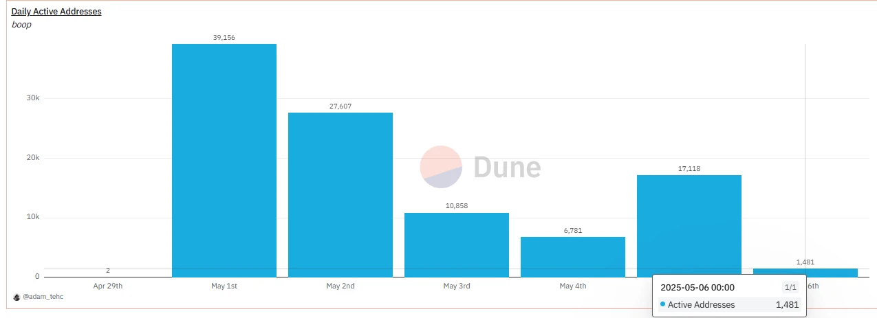 Dune 上关于 Boop.fun 的 数据面板 显示,平台上线的 5 天内,每日发射的代币呈现明显的下滑趋势;截止发稿前一天,Boop 上日发射代币已从开局的 1 万个滑落到 1-2000 个,同时活跃地址数也出现了每日递减式的下滑。