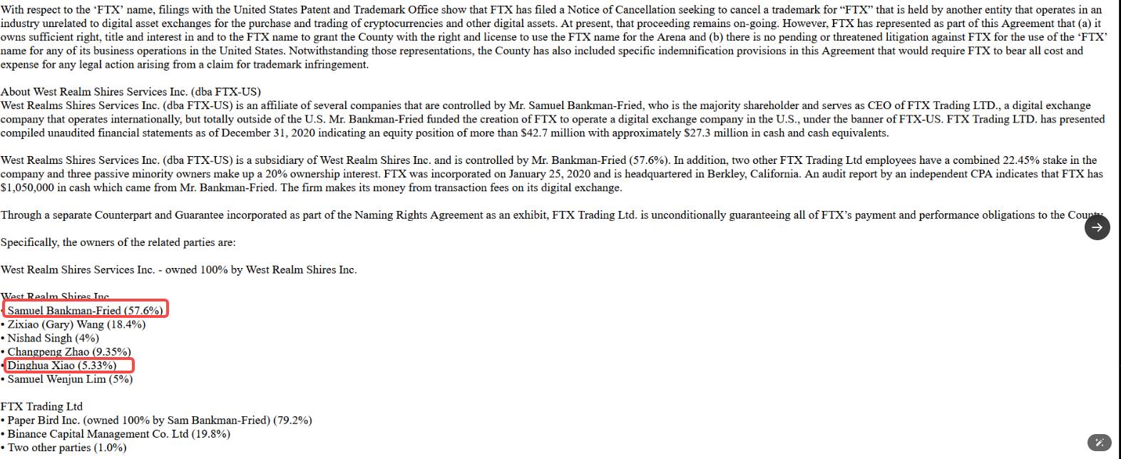 此外,更多信息显示 Ding Hua Xiao 还是 Binance 与 FTX 的合资公司 West Realm Shires Inc 的成员之一,而该公司是 FTX 的一个关键实体,控制了 FTX 在美国的运营(即 FTX-US)。