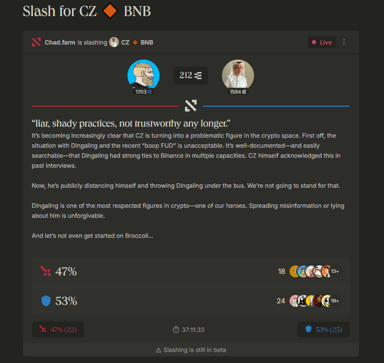 Ethos Network 上,一位仅 215 粉的小用户 @chadstrdaumus 0 发起了一场“削减” 提案 ,试图用去中心化治理的方式惩罚 CZ 关于 Boop 的 FUD。