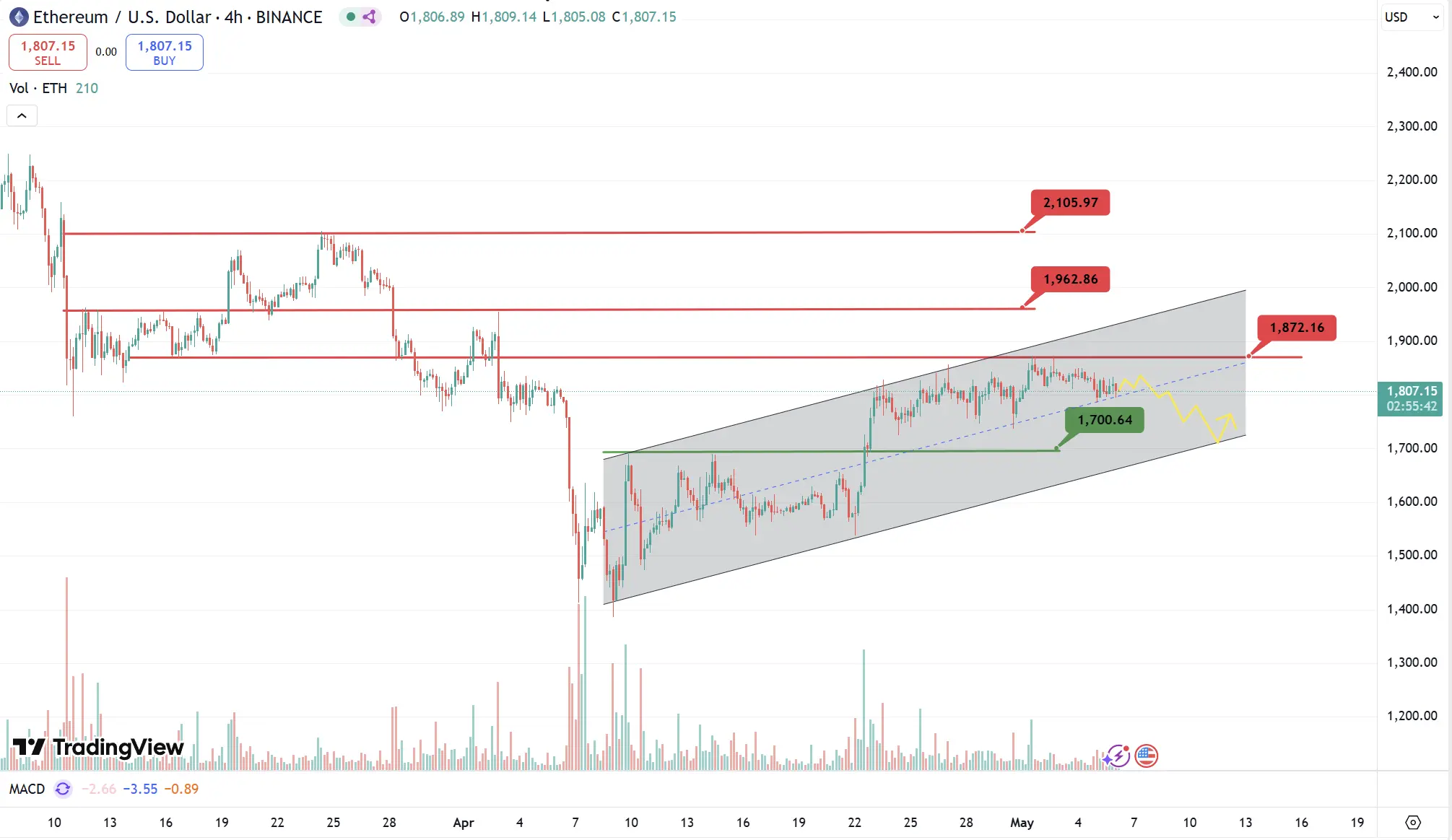 尽管上周ETH继续沿上升通道的上半部分运行,但在遭遇1870美元强阻力的打压下已展现明显的滞涨信号,尽管币价仍受通道中轨支撑,但上涨动能正逐步枯竭,即便后续继续组织反弹但能够有效突破1870美元甚至向1960美元二线阻力测试的概率都偏低。反而若随着基本面走弱,走势跌破中轨并向下沿也就是1700美元支撑靠近的概率偏高,但无论如何,当前上升通道形态还未被破坏,因此用户仍可根据上中下轨的支撑阻力进行操作。