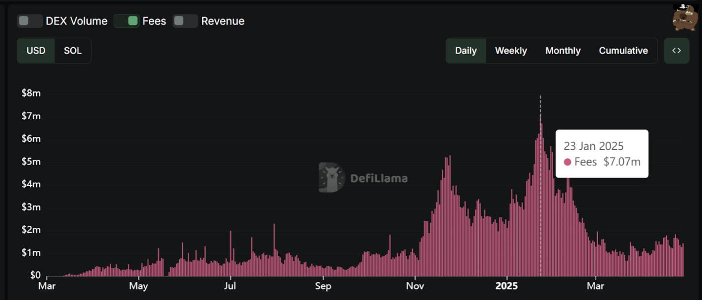 相信 Pump Fun 一定不陌生,2024 下半年的迷因狂潮便从这里开启,在巅峰时期一天可以赚取超过 700 万美元,即使是现在迷因降温的现在,也约有着每日 150 万美元的水准,上线至今总共赚取超过 6 亿美元,是币圈印钞机当之无愧。
