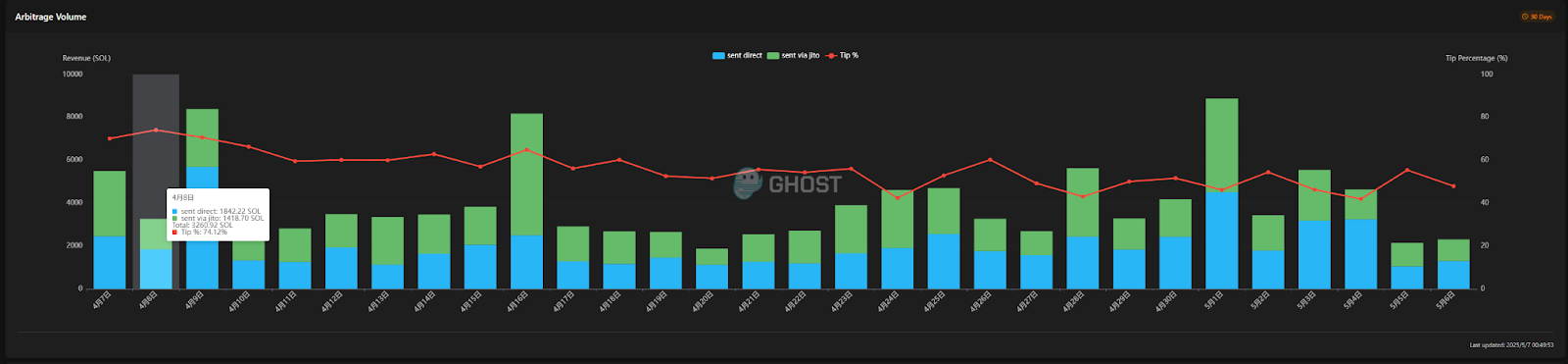 根据sandwiched.me的数据显示,这种原子套利在链上的占比已经达到了夸张的程度。4月8日,原子套利贡献的小费比例达到了74.12%,而在其他时间,也基本维持在50%以上。也就说,现在Solana链上的每两笔交易,可能就有一笔是用于原子套利。