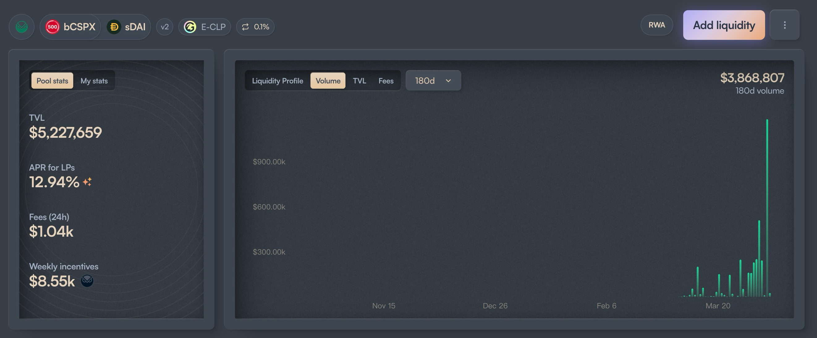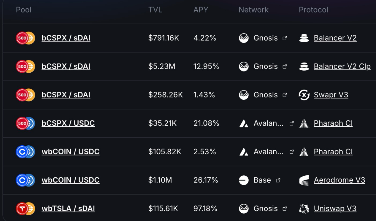 从发行量上来看,Backed 的采用主要集中在 CSPX 和 COIN 两种资产上,其中前者发行量约 $10M,后者为 $3M 左右。而链上流动性方面,主要集中在 Gnosis 和 Base 两条链上,其中 bCSPX 的流动性约 $6M,wbCOIN 的流动性约 $1M。而交易量方面,则并不是很高,以 bCSPX 最大的流动池为例,自 2025 年 2 月 21 日部署起,累计交易量约 $3.8M,累计 Transaction 数约为 400 次。