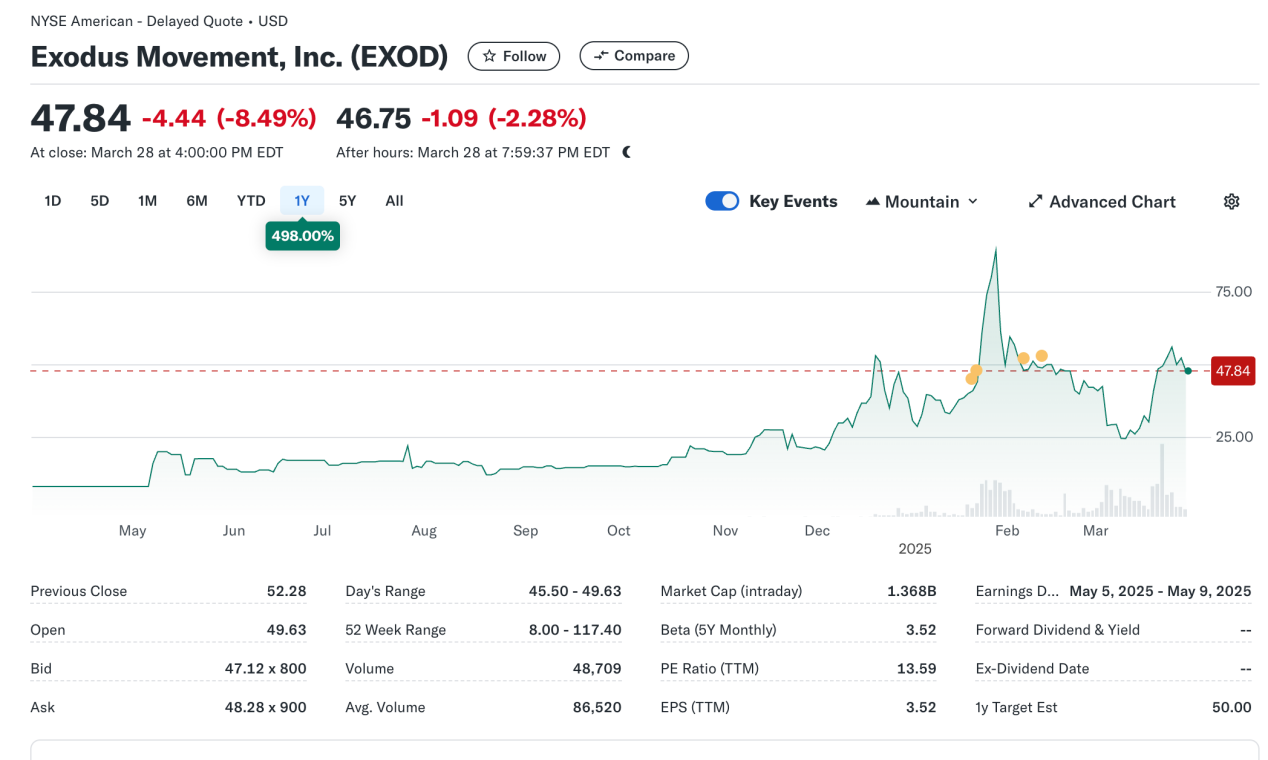 该事件具有一定的标志性意义,标志着 SEC 对于链上股票资产的态度有明显的转变,事实上 Exodus 对于发行链上股票的尝试并不是一帆风顺。2024 年 5 月,Exodus 就首次提交普通股代币化的相关申请,但由于彼时 SEC 监管政策并没有转向,导致上链计划遭到初步拒绝。但随后在 2024 年 12 月,经过对技术方案、合规措施以及信息披露的不断完善后,Exodus 最终获得了 SEC 的批准,并成功完成了普通股代币化的上链。这一事件也令该公司股票在市场上获得追捧,价格达到历史高点。
