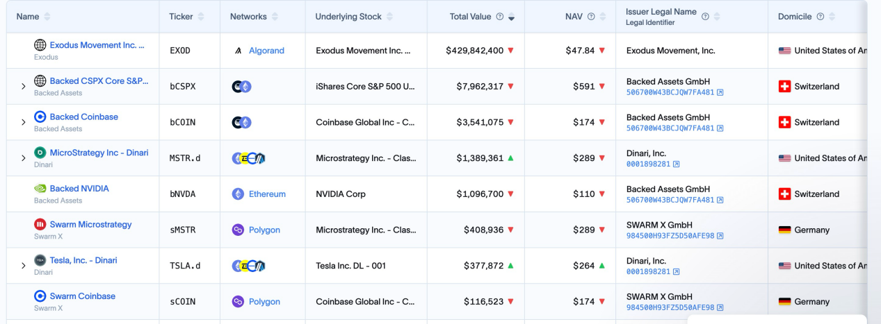 那么接下来我们来介绍一下当前股票 RWA 的市场现状。总的来说,该市场尚处早期阶段,且仍然以美股为主。根据 RWA.xyz 的数据显示,当前的股票 RWA 市场的总发行量达到了 $445.40M,但是值得注意的是,其中 $429.84M 的发行量要归因到一个标的 EXOD,这是 Exodus Movement, Inc.发行的链上股票,这是一家专注于开发自托管加密货币钱包的软件公司,该公司成立于2015年,总部位于美国内布拉斯加州。该公司的股票在纽交所(NYSE America)上市发行,并允许用户将其普通 A 类股迁移到 Algorand 区块链上管理,用户可以在 Exodus Wallet 直接查看这部分链上资产的价格,目前该公司的总市值为 $1.5B。