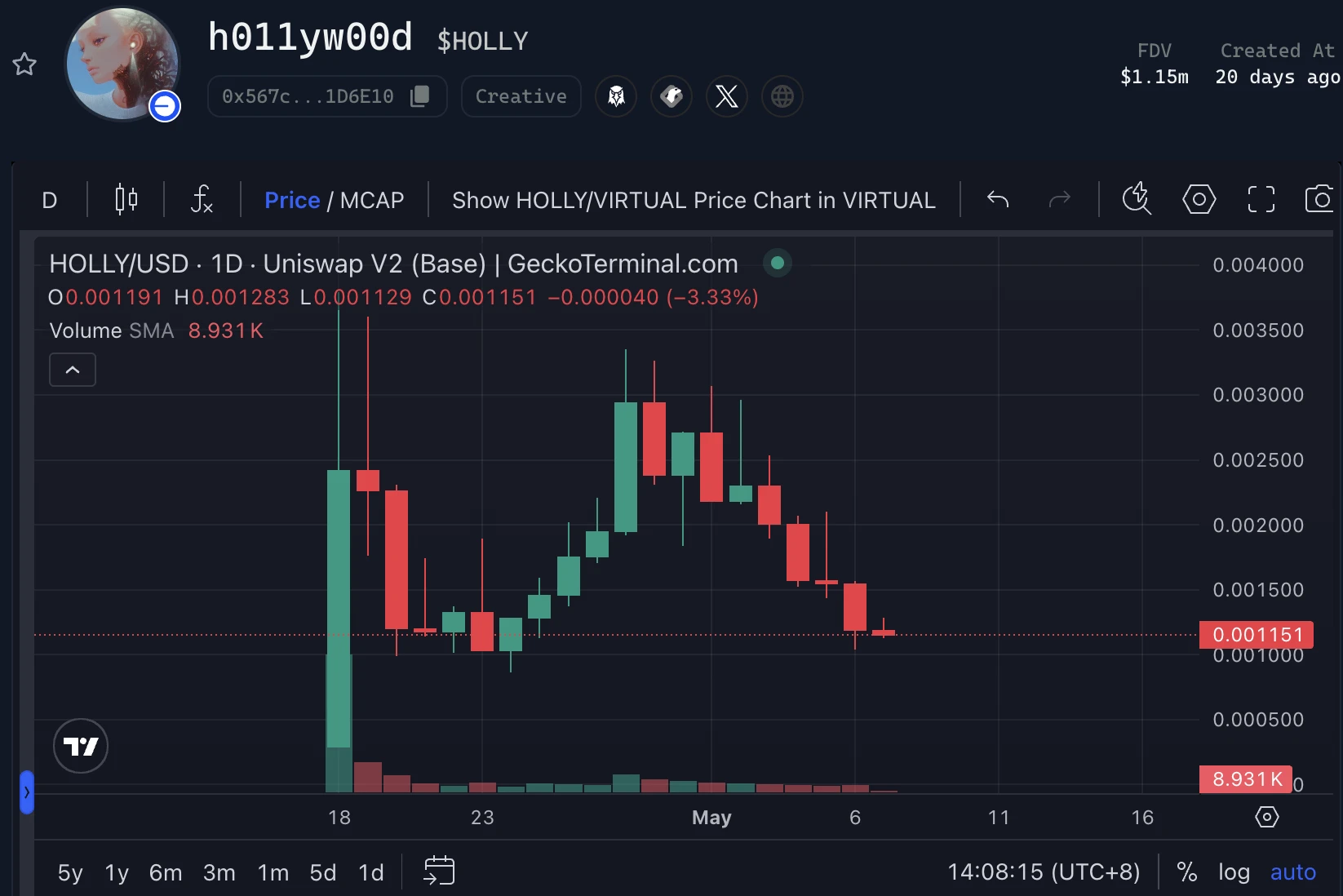 根据 Virtuals 平台数据 ,HOLLY 市值最高触及 400 万美元,目前市值 120 万美元附近。