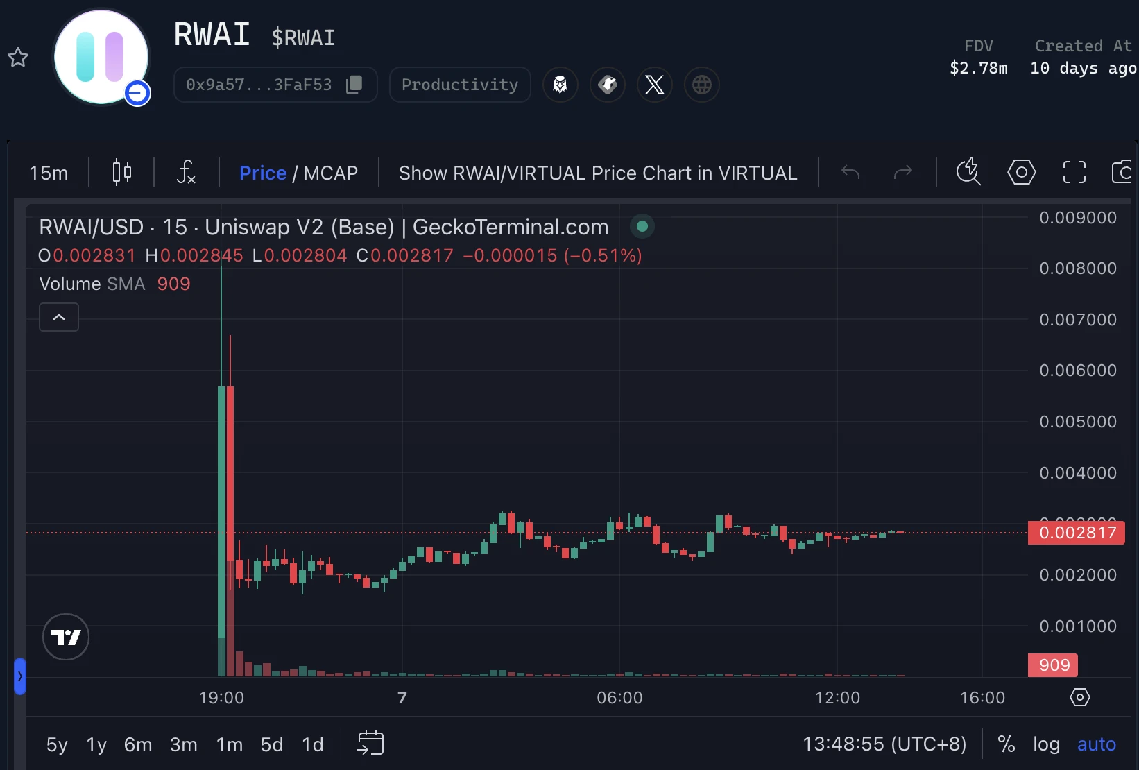 根据 Virtuals 平台数据 ,RWAI 昨日开盘市值最高触及 800 万美元,目前市值 280 万美元附近。