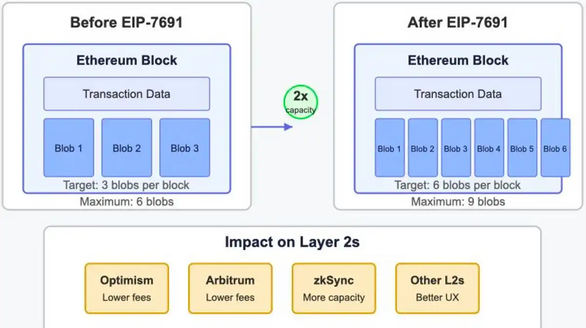 该提案通过将每个区块的 blob 数量翻倍(从 3 增加到 6 ,或从 6 增加到 9),提升了 Rollup 的数据容量。