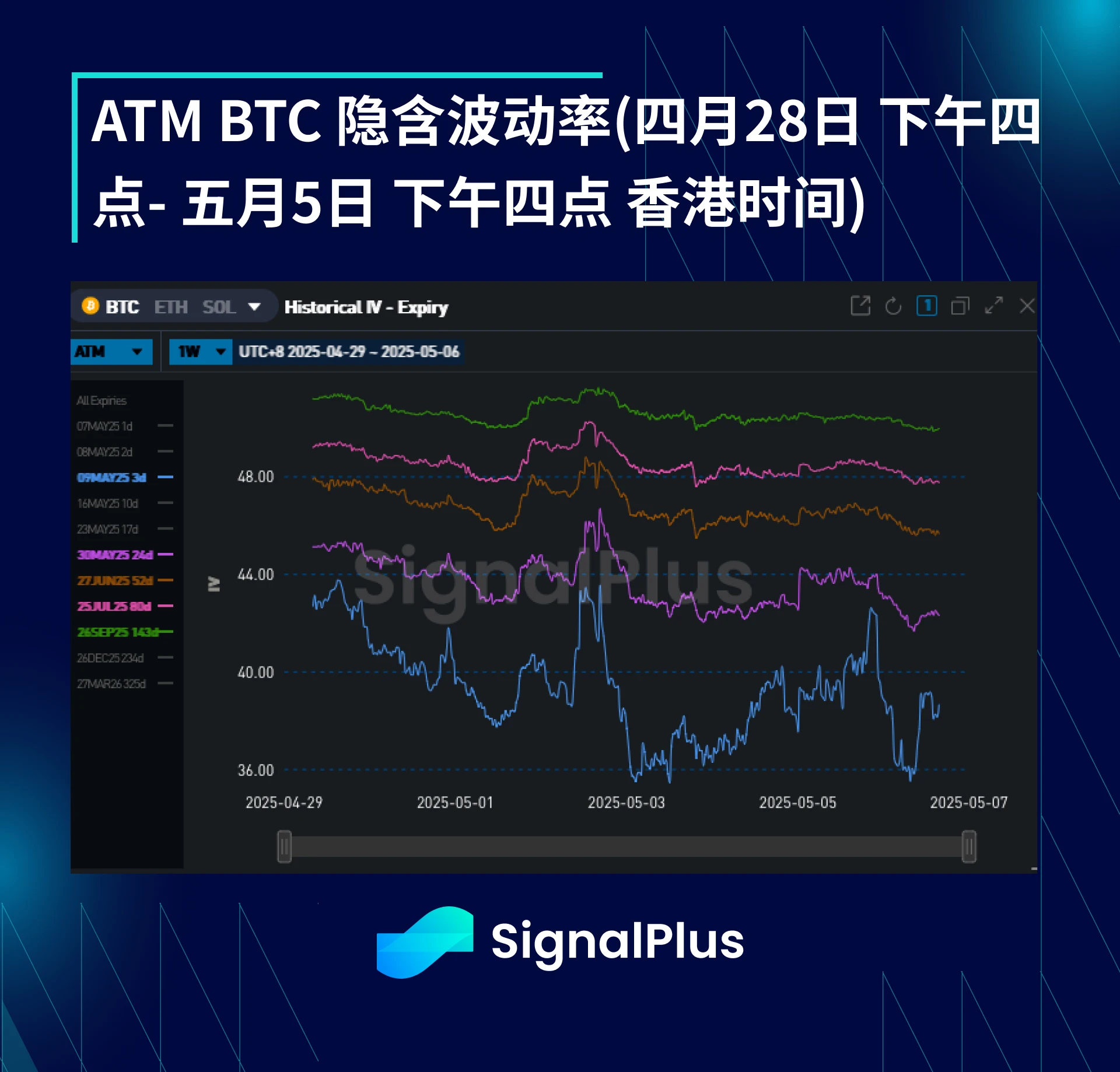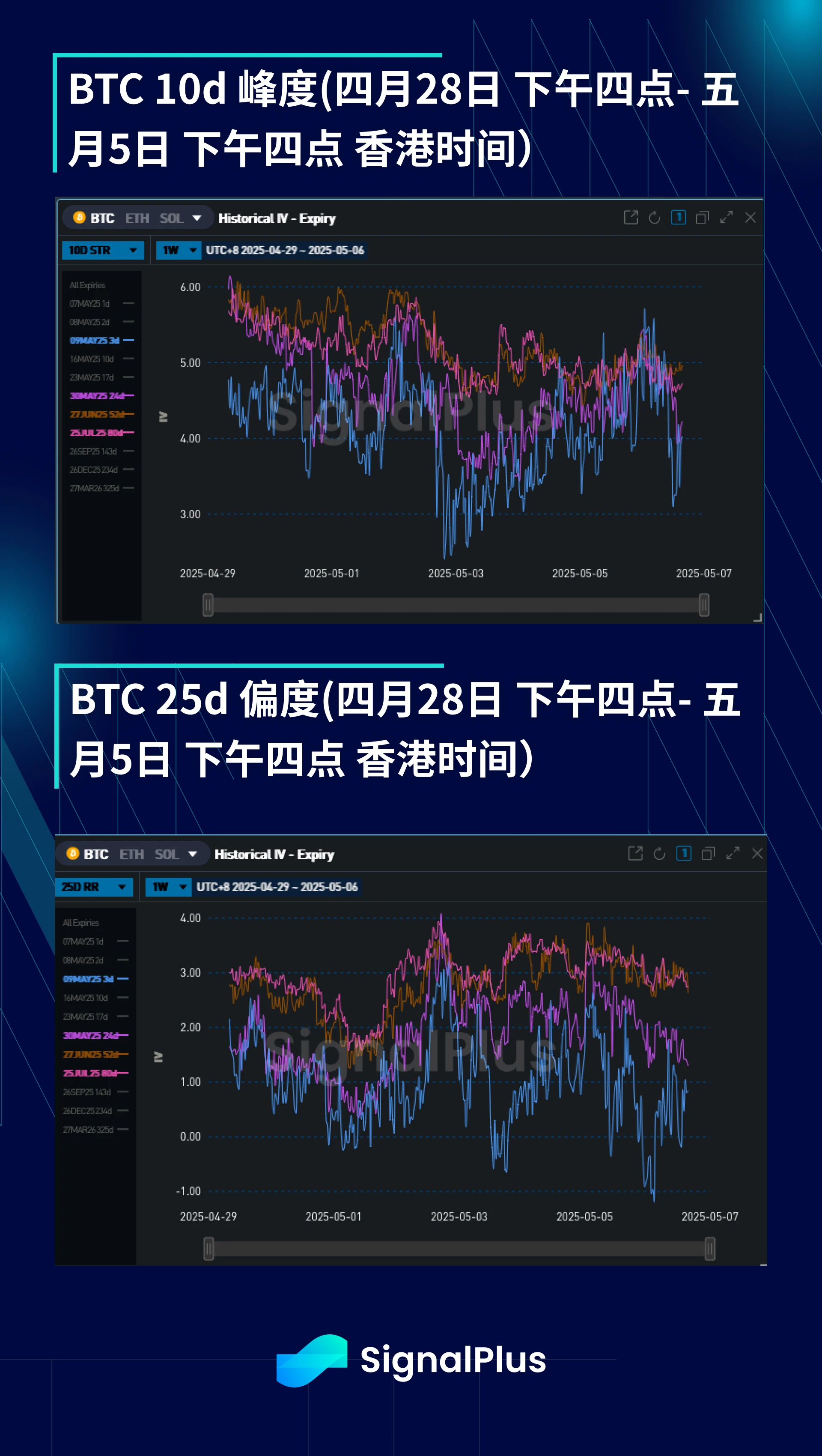 上周隐含波动率在上周一因为币价爬高而短暂上涨,之后逐步降低。高频实际波动率锁定在 30 出头的水平,同时期限结构非常陡峭(目前市场定价在五月底到六月会回到 50 几的波动率水平),意味着目前在期限远端任何拿多头的头寸都很难赚钱。我们怀疑市场因为过去几周的卖压持有多头头寸并且很难拿住,因此短期到期日的波动率才会被压低至此。
