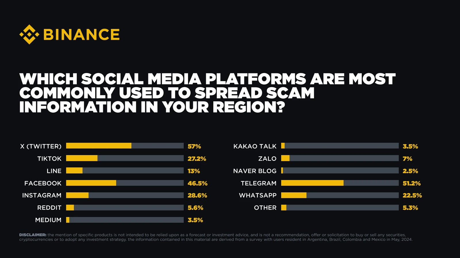 为了推动反诈骗教育,有效了解用户最常接触误导性或诈骗信息的渠道也非常重要。在亚太地区,常见的诈骗信息集中于 X(原 Twitter,占 57% )与 Telegram(51.2% )。但在不同市场渠道略有差异——东南亚最主要的平台是 Facebook(61.1% ),而在印度,WhatsApp 是关键渠道(42.5% )。