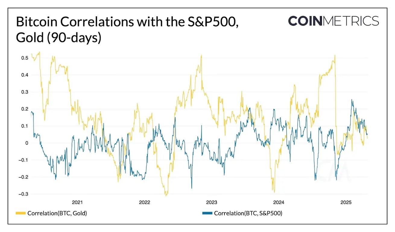 要判断一种资产是否与另一种资产脱钩,最直接的方法是查看回报率之间的相关性。下面是比特币与标准普尔 500 指数和黄金之间 90 天回报率相关性的图表。
