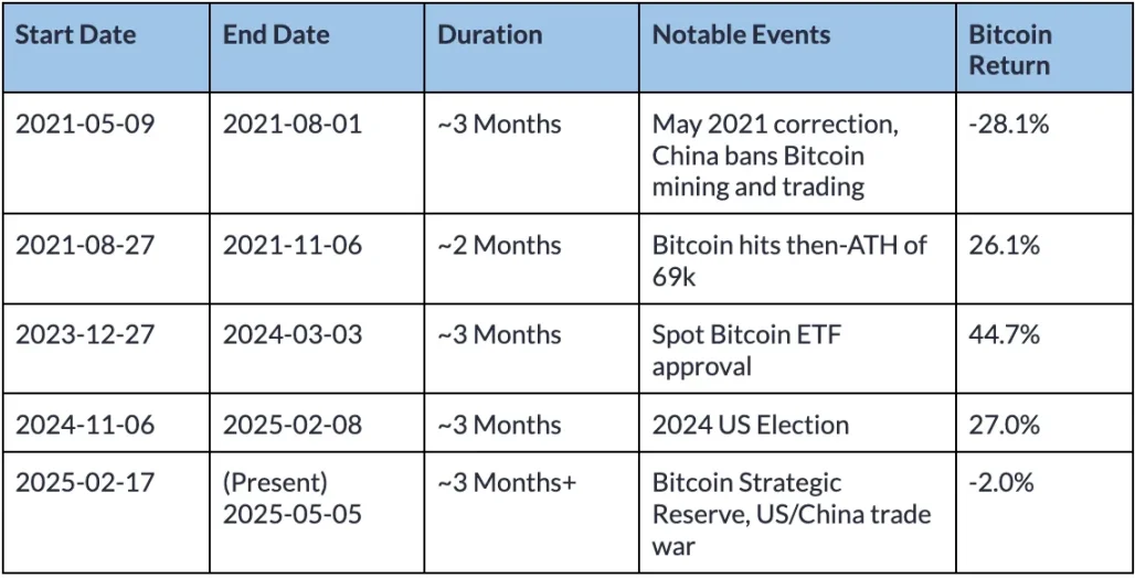 不出所料,过去比特币与其他资产的脱钩情况发生在加密货币市场出现重大冲击的特殊时期,比如中国对比特币的禁令以及比特币现货 ETF 的获批。从历史上看,低相关性时期通常持续 2 到 3 个月左右,不过这取决于你所设定的相关性阈值。