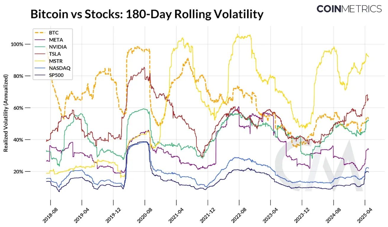 然而,自 2021 年以来,比特币的 180 天已实现波动率逐渐下降,最近即使在市场波动率较高的情况下,也稳定在 50%-60% 左右。这使其波动率与许多广受欢迎的科技股相当,低于 MicroStrategy(MSTR)和特斯拉(TSLA),而与英伟达(NVIDIA)的波动率非常接近。尽管比特币仍然容易受到短期市场波动的影响,但与过去的周期相比,其相对稳定性可能反映了它作为一种资产的成熟度。