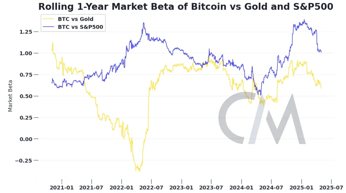 随着我们进入 2025 年,比特币相对于标准普尔 500 指数和黄金的 beta 系数开始下降。尽管对比特币对这些资产的依赖程度正在降低,比特币仍然对市场风险敏感,其回报率也仍然与市场回报率相关。比特币可能正在成为一种独特的资产类别,但它的交易方式在很大程度上仍类似于风险偏好资产,目前还没有强有力的证据表明它已经成为一种 「避险资产」。
