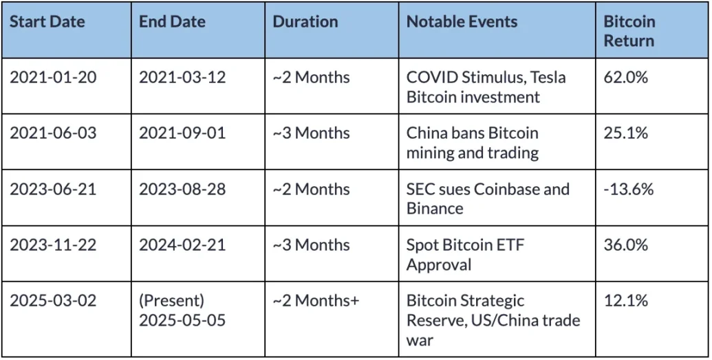 当相关性如此之低时,通常会发生什么呢?我们整理了比特币与标准普尔 500 指数和黄金的滚动 90 天相关性低于显著阈值(约 0.15)的时间段,并标注了当时最值得关注的事件。