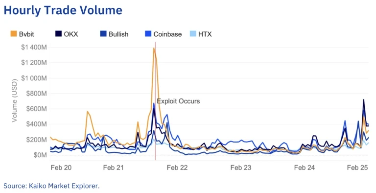 Kaiko 数据显示,事件发生后,Bybit 的小时交易量一度飙升至 12 亿美元。尽管随后交易量在周末短暂回落,但此后稳步回升,凸显出用户粘性和对 Bybit 市场韧性的持续信任。